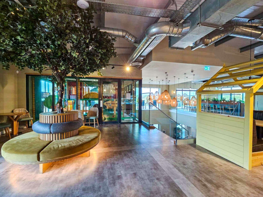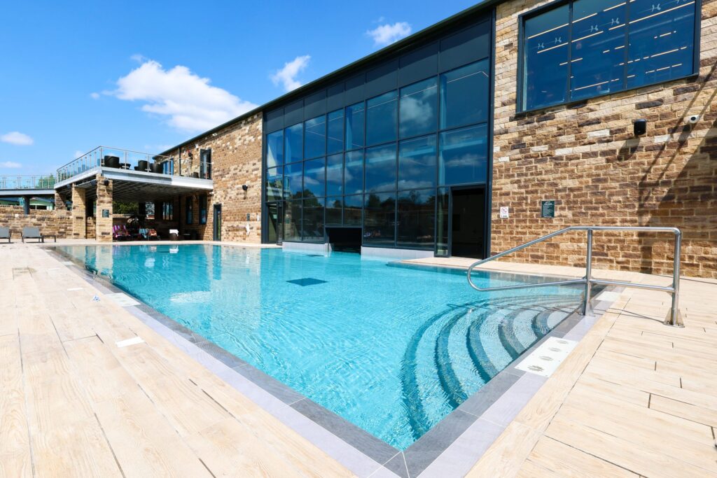 A modern leisure complex sits at the heart of the park, offering heated indoor and outdoor swimming pools, a gym, and relaxed social spaces including a bar and restaurant. An adult arcade area provides light entertainment that complements the park’s calm, owner-focused atmosphere.