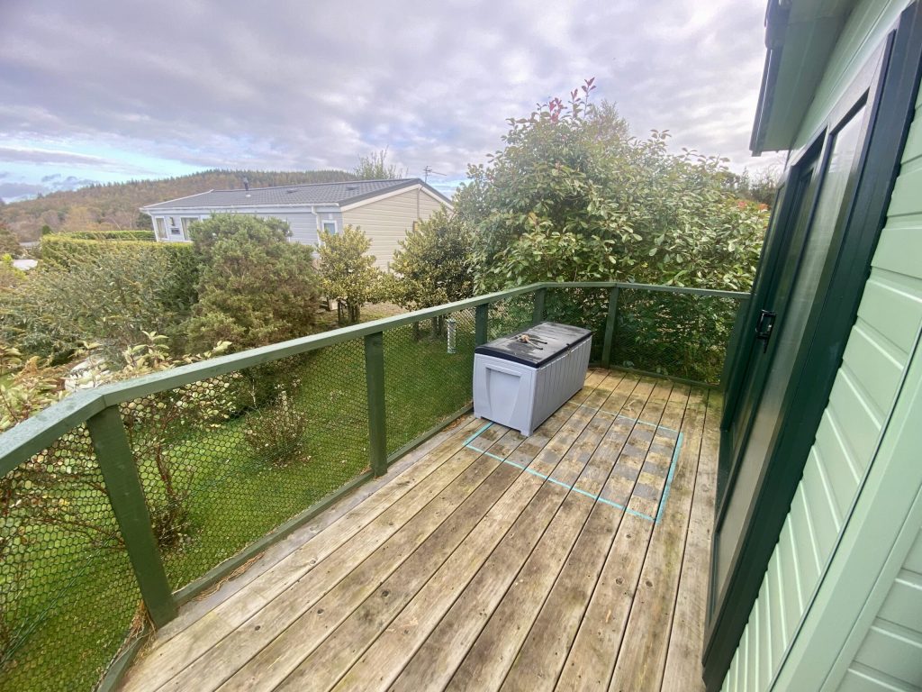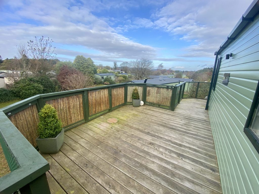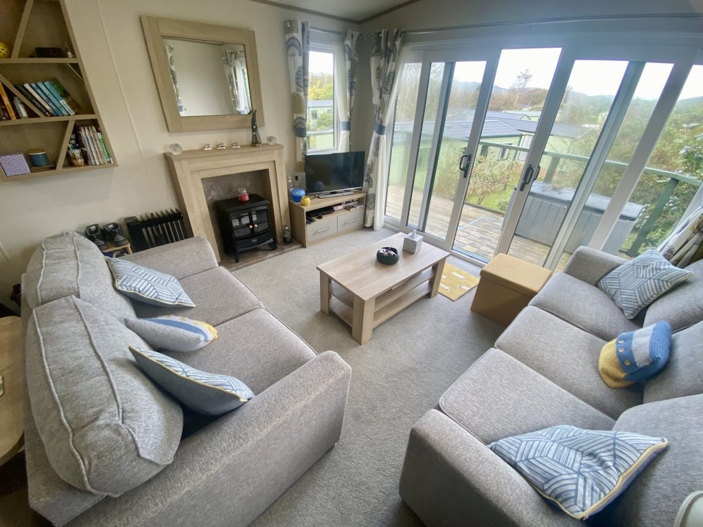 The bright and welcoming living area is a true highlight, featuring double sliding patio doors that flood the space with natural light and frame the impressive outlook. Step outside onto the large decking area, perfect for outdoor dining, relaxing with a morning coffee, or simply soaking up the scenic surroundings.