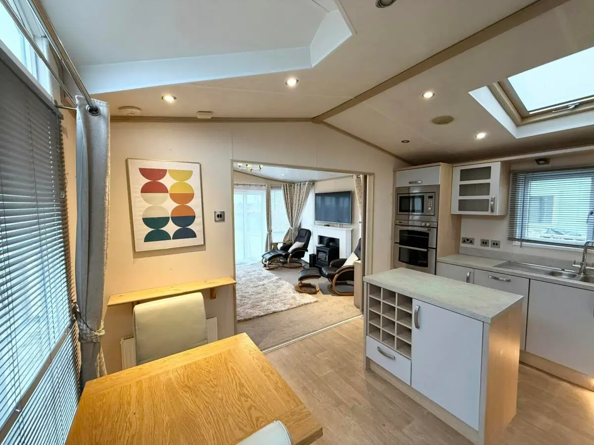 The ABI Alderley Premier features two bedrooms – a twin bedroom and a beautiful and generously furnished master bedroom with king-sized lift up bed and en-suite toilet. 37'x12', 2 bedrooms, fully winterised & galvanised, front sliding patio doors, feature ‘stove’ fireplace, integrated microwave, integrated 70/30 fridge/freezer, family shower room, en-suite WC. The kitchen area is distinctive with a unique curved worktop and feature extractor. In addition, the kitchen area has integrated fridge-freezer and microwave plus gas hob and oven for that little touch of extra luxury; the cupboards and drawers are fit with soft close hinges.