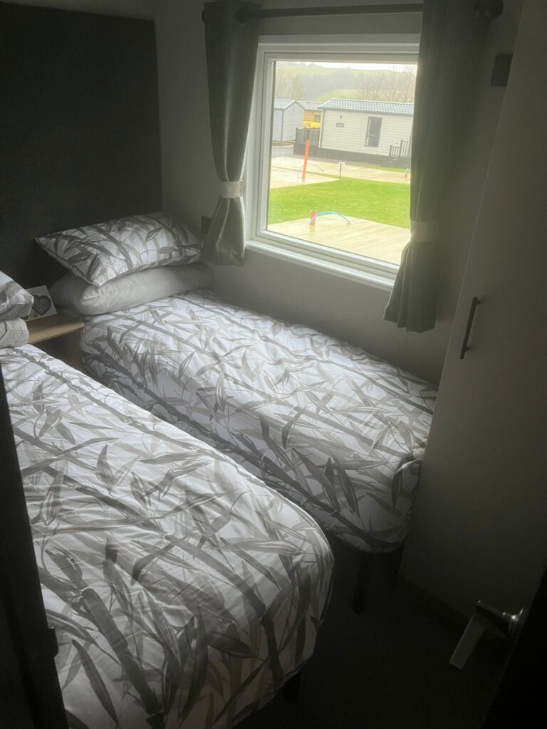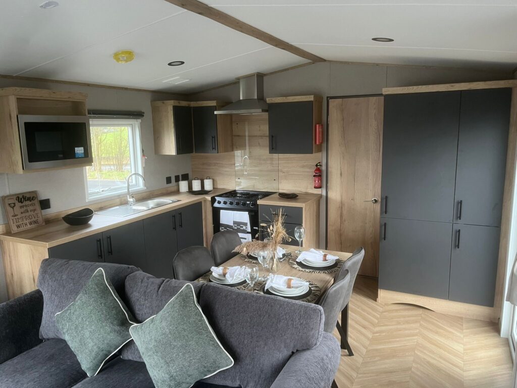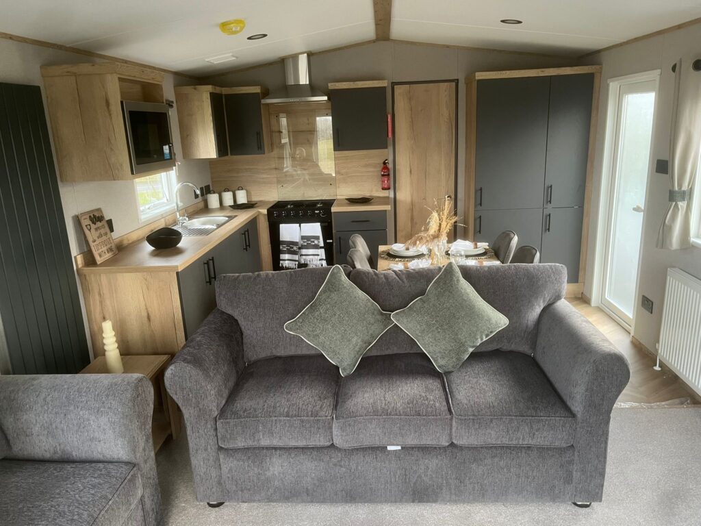 This Abi Alton Premier static caravan measures 37×12 and offers two bedrooms and two bathrooms with two showers, providing six-berth accommodation. The layout features an open-plan kitchen and living area, including a double bedroom, a twin bedroom, and a sofa bed. The arrangement provides practical and flexible living and sleeping space suitable for families or groups.