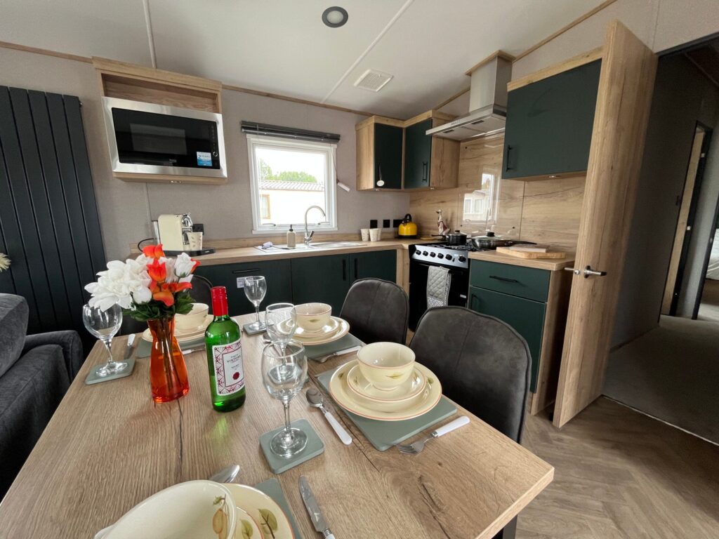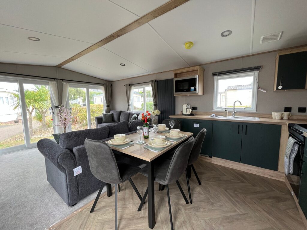 Step inside to a spacious living area filled with natural light from large patio doors. A freestanding sofa and soft furnishings create a cosy yet contemporary feel, while the fully equipped kitchen — complete with integrated appliances and a convenient dishwasher — makes family mealtimes and entertaining effortless.
