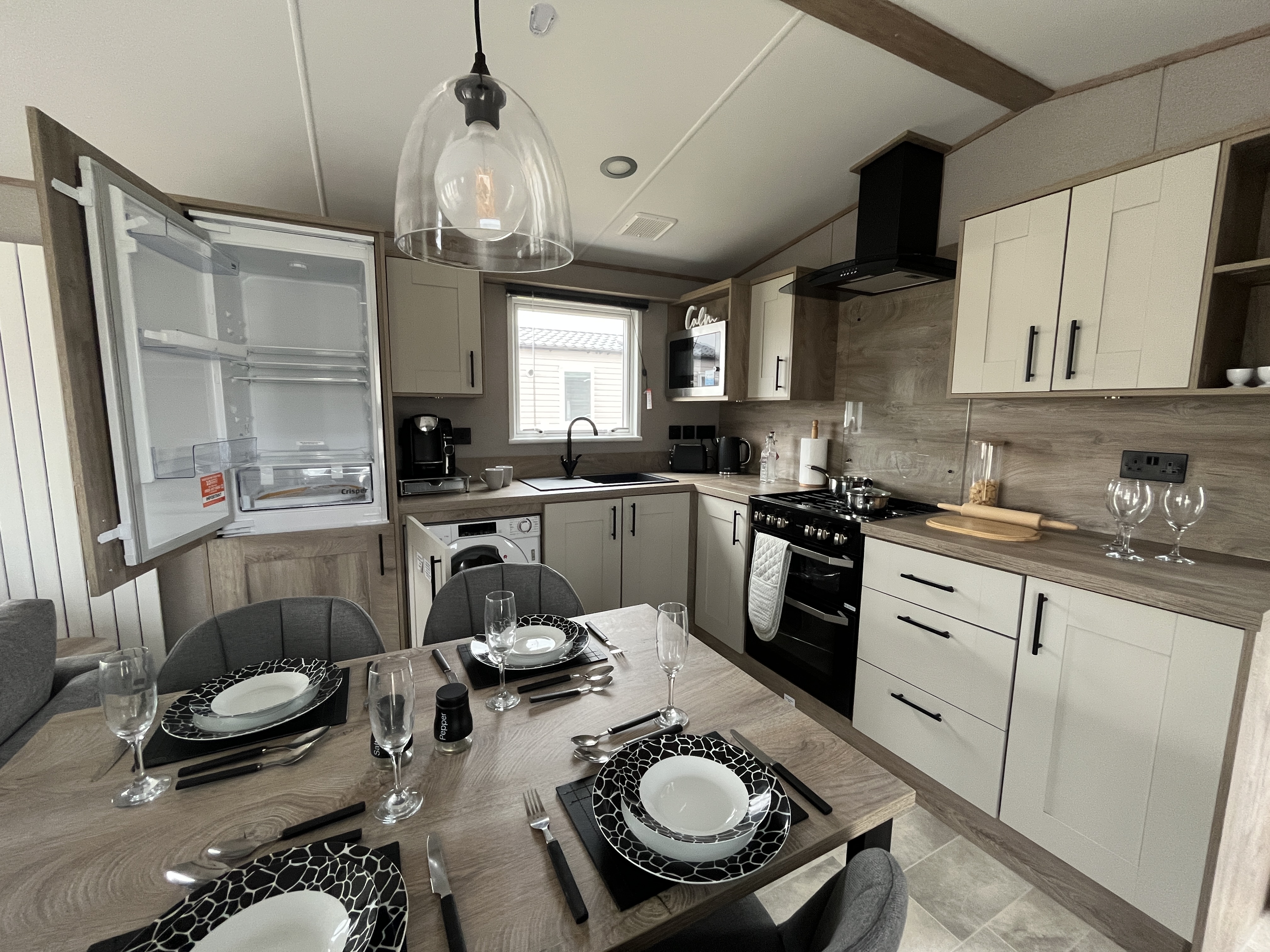 You are then greeted by an open plan kitchen/living and dining area. Your kitchen is completed with a dishwasher, built in oven & hob, microwave & fridge freeze. This lodge has the added bonus of a separate utility room with washing machine, sink, and plenty of storage cupboards.