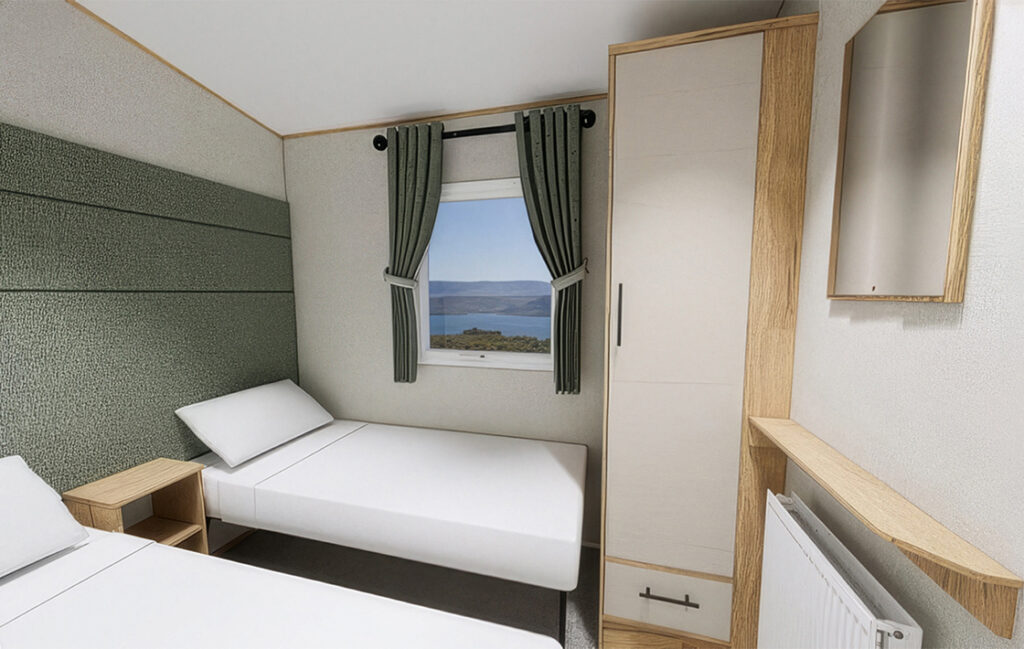 Presenting the stylish ABI Isley, designed for relaxed yet refined holiday living. This contemporary model boasts a thoughtfully planned layout, featuring a spacious master bedroom complete with a private en-suite bathroom, as well as a welcoming twin room with two single beds. The open-plan living and dining area creates an inviting space to unwind, with two sofas offering ample seating for family and friends. Light, airy, and perfectly proportioned, the ABI Isley blends comfort and practicality with modern design for an effortlessly enjoyable stay.
