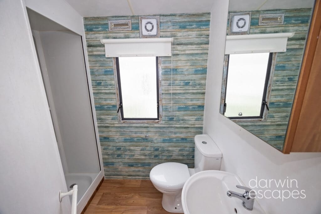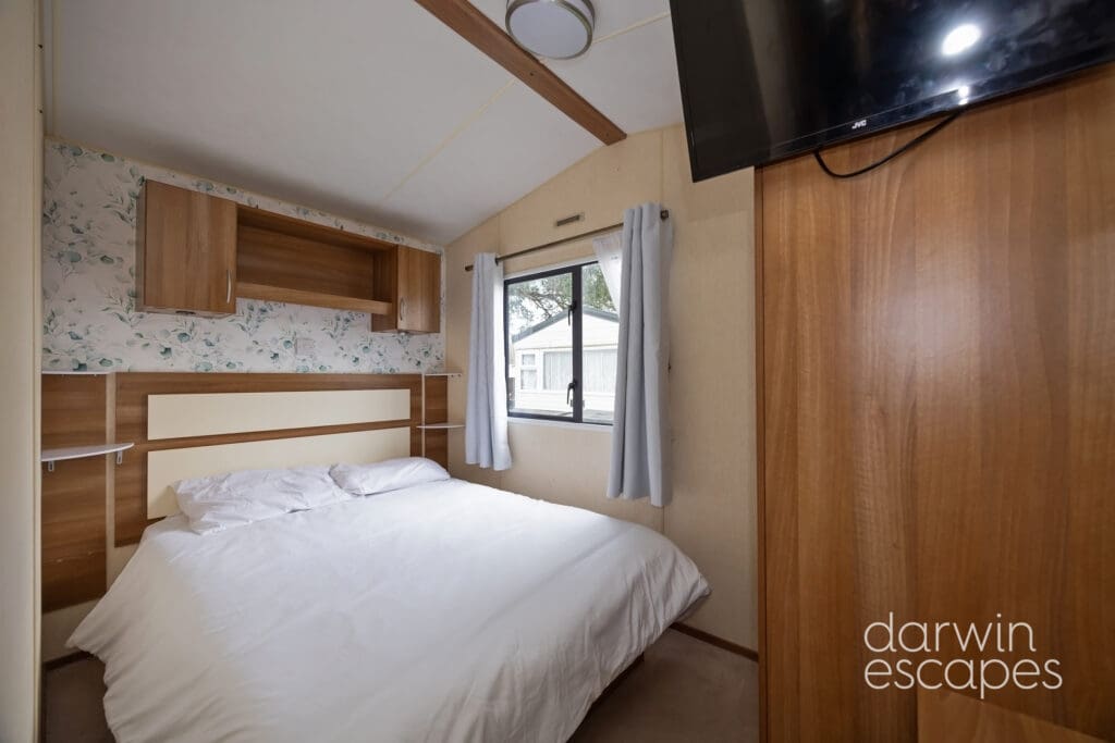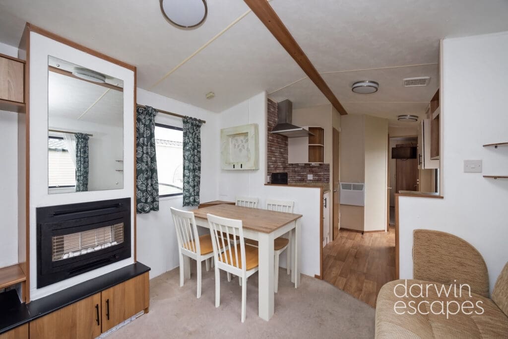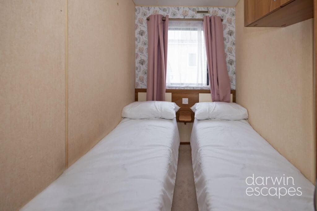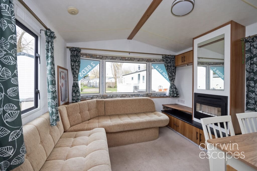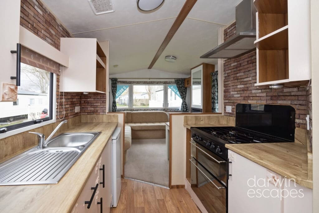 The caravan includes two well-proportioned bedrooms, a family shower room, and a fully equipped kitchen, creating a practical living space.
