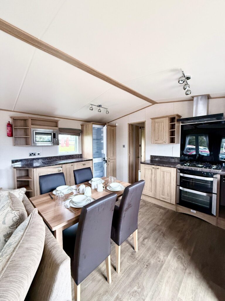 The well-appointed kitchen delivers a true lodge feel, with wood-effect cabinetry, marble-style worktops, and quality appliances throughout. Integrated features include a fridge-freezer, built-in microwave, gas hob with separate oven and grill, and a concealed washer/dryer. Ample storage and a proper dining table with four high-back chairs make this a practical yet sociable heart of the home.
