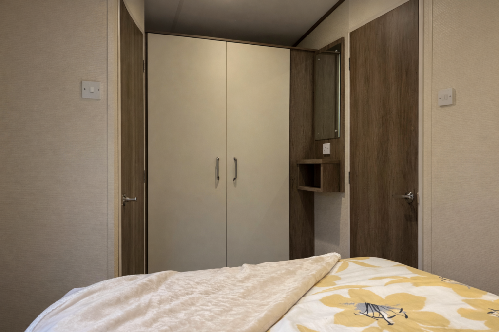 The holiday home benefits from three well-proportioned bedrooms, including a comfortable master bedroom with fitted storage, alongside two additional bedrooms that are ideal for children, guests, or visiting family. A modern family shower room completes the interior, finished with clean lines and practical fittings.