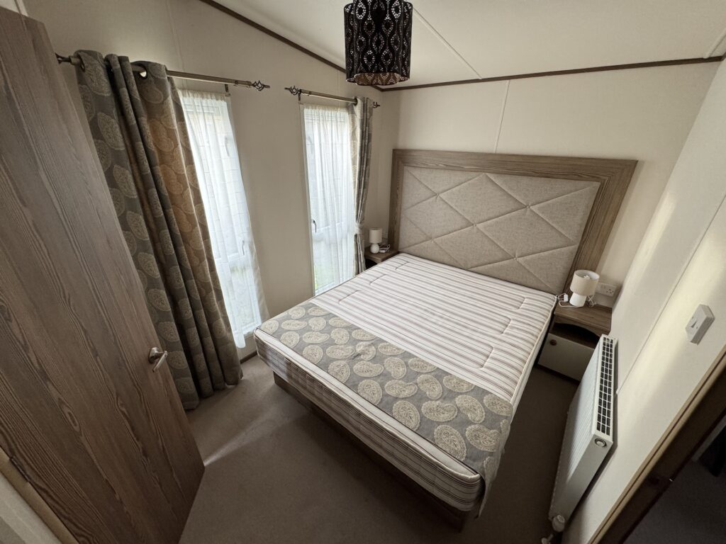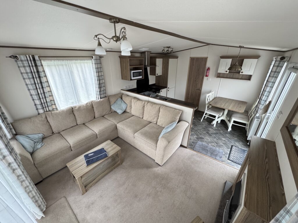 The exterior of the caravan is enhanced by a spacious decking area, providing an excellent space for outdoor relaxation and enjoying the picturesque riverside views. The double glazing and central heating ensure that the caravan remains cosy and warm throughout the year, regardless of the weather.