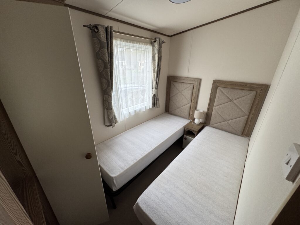 The master bedroom is a sanctuary of comfort, featuring a double bed with ample storage space, including built-in wardrobes and bedside tables. This room also includes an en suite washroom with a WC and wash basin, providing a private and convenient space for getting ready. The twin bedroom is equally inviting, with two single beds and sufficient storage, making it ideal for children or guests.
