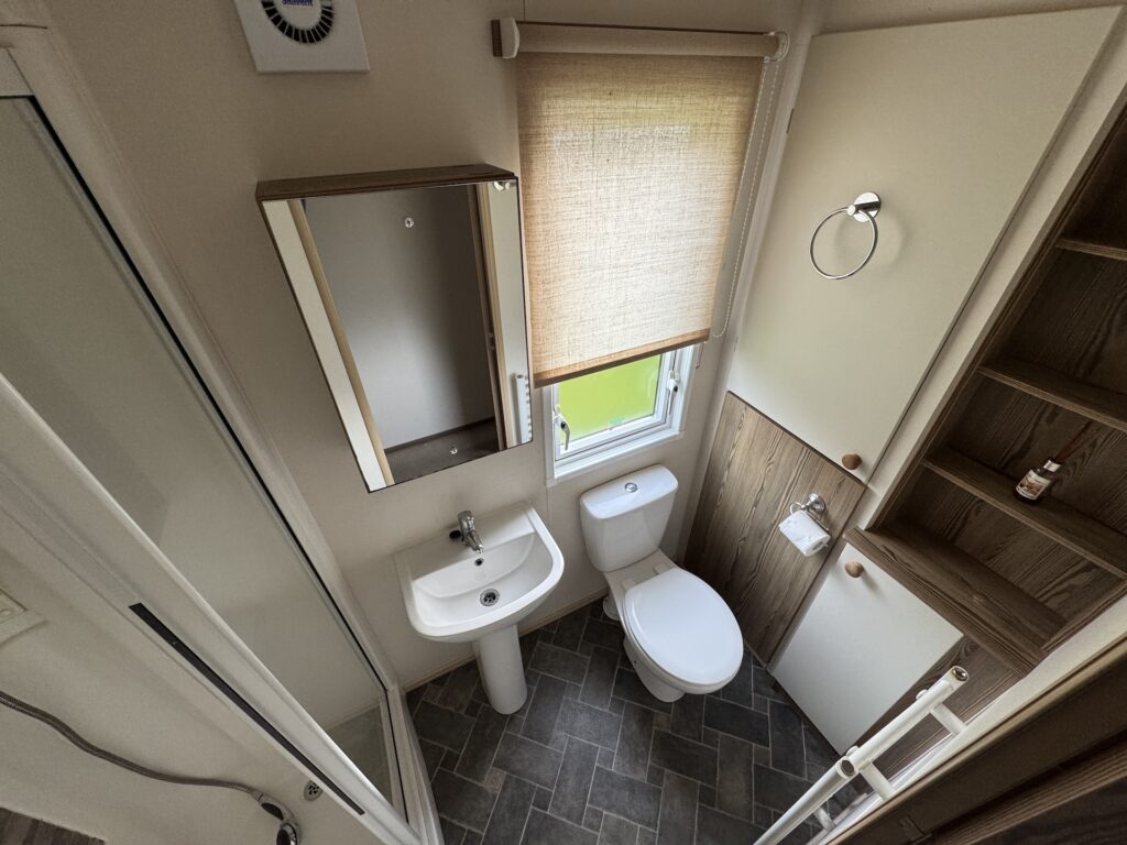 The family shower room is well-appointed with modern fixtures and fittings, including a large shower enclosure, a washbasin, and a toilet. The practical layout ensures convenience and ease of use for all occupants.