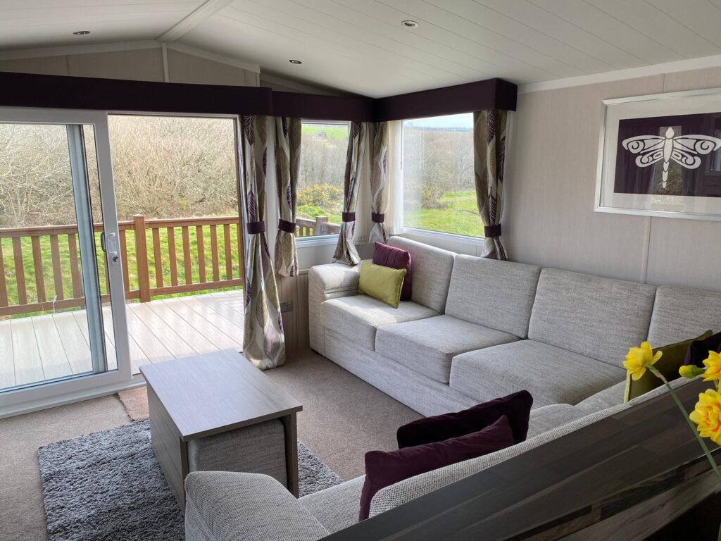 The interior of the Swift Moselle immediately stands out with its bright, open‑plan layout, enhanced by large windows that make the space feel exceptionally welcoming. The lounge features comfortable furniture, coffee table and sliding patio doors leading to a private decking with a wonderful view across the River Hayle.