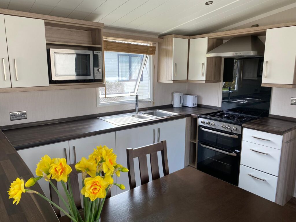 The fully equipped kitchen offers generous worktops, integrated fridge‑freezer, gas oven and hob, and a dedicated dining area—ideal for hosting family and friends or enjoying relaxed evenings in. The design and finish deliver the warmth and homeliness buyers look for in a long‑term holiday property.