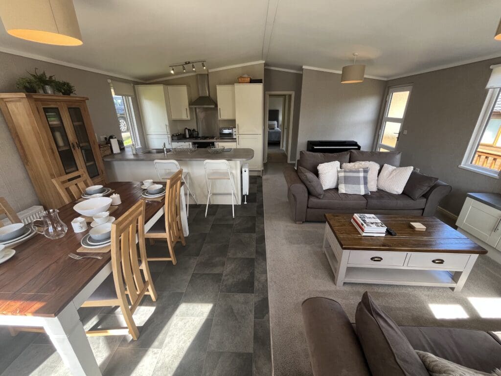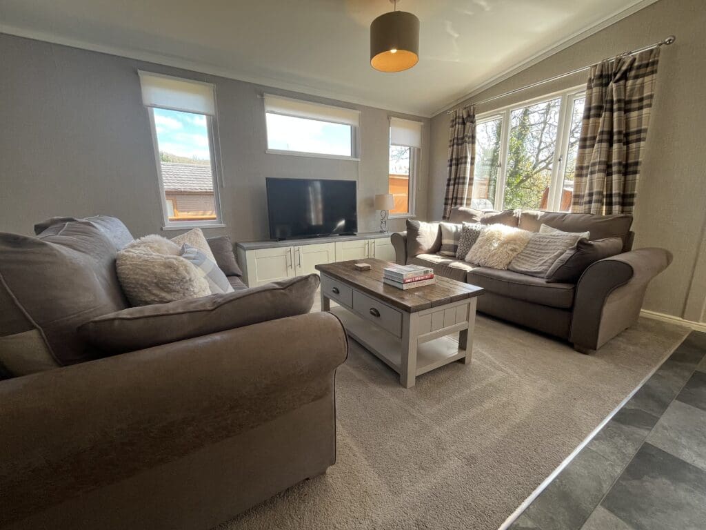 Exceptional holiday home for sale at Cheddar Woods Resort and Spa. Sited on a premium plot with stunning views, you’ll asre this two bedroom, two bathroom Homeseeker Olympia. Highlights include a walk-in wardrobe, fully fitted kitchen with appliances included, parking space and this season’s site fees included in the selling price.