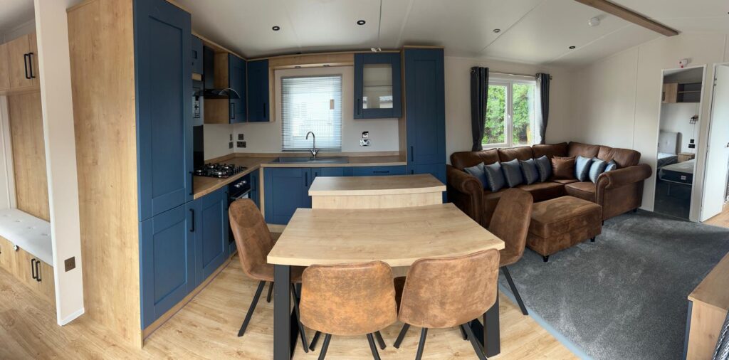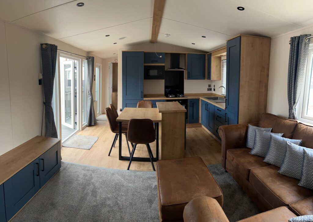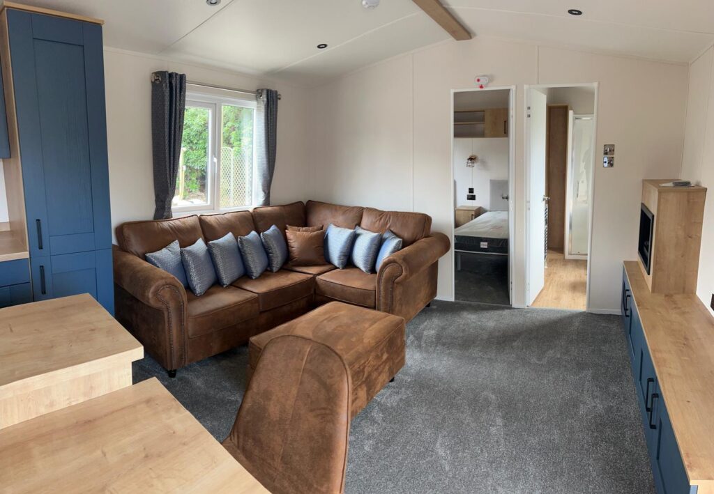 This Love Holiday Derwent static caravan measures 40×13 and is a brand new model with two bedrooms and two bathrooms. The layout features a central living room with an open-plan design connecting the living area and kitchen. It includes a double bedroom and a twin bedroom, with bathroom facilities positioned for practical access from the main living space.