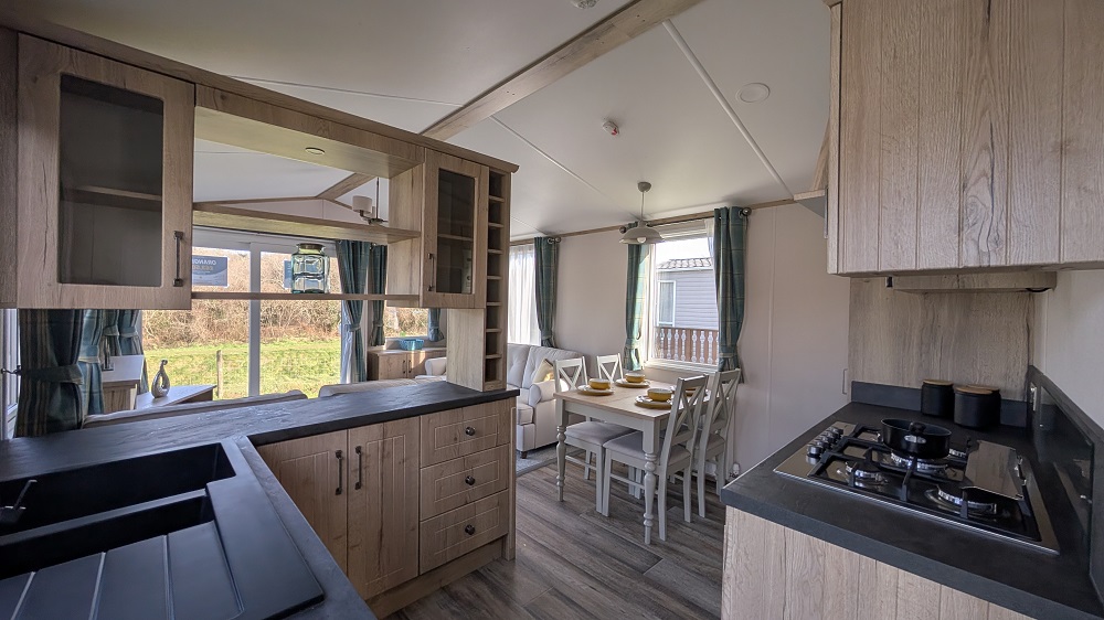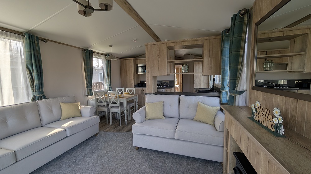 As you step into the lounge, you’re welcomed by the Debonair’s signature country‑chic design. The freestanding sofas, classic tartan accents, and feature fireplace create a cosy, inviting atmosphere that feels instantly homely. Large windows allow natural light to fill the room, enhancing the soft, neutral tones and giving the whole space a peaceful, relaxing ambience—ideal for unwinding after a day out or enjoying quiet evenings in.