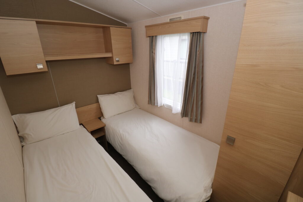 Both bedrooms are well-proportioned, with the main bedroom offering comfortable sleeping space, wardrobe storage, and room to move around easily. The second bedroom is perfect for guests or children, fitted with twin beds and additional storage options. The bathroom is fresh and functional, featuring a shower, basin, and toilet, everything you need for a comfortable stay.