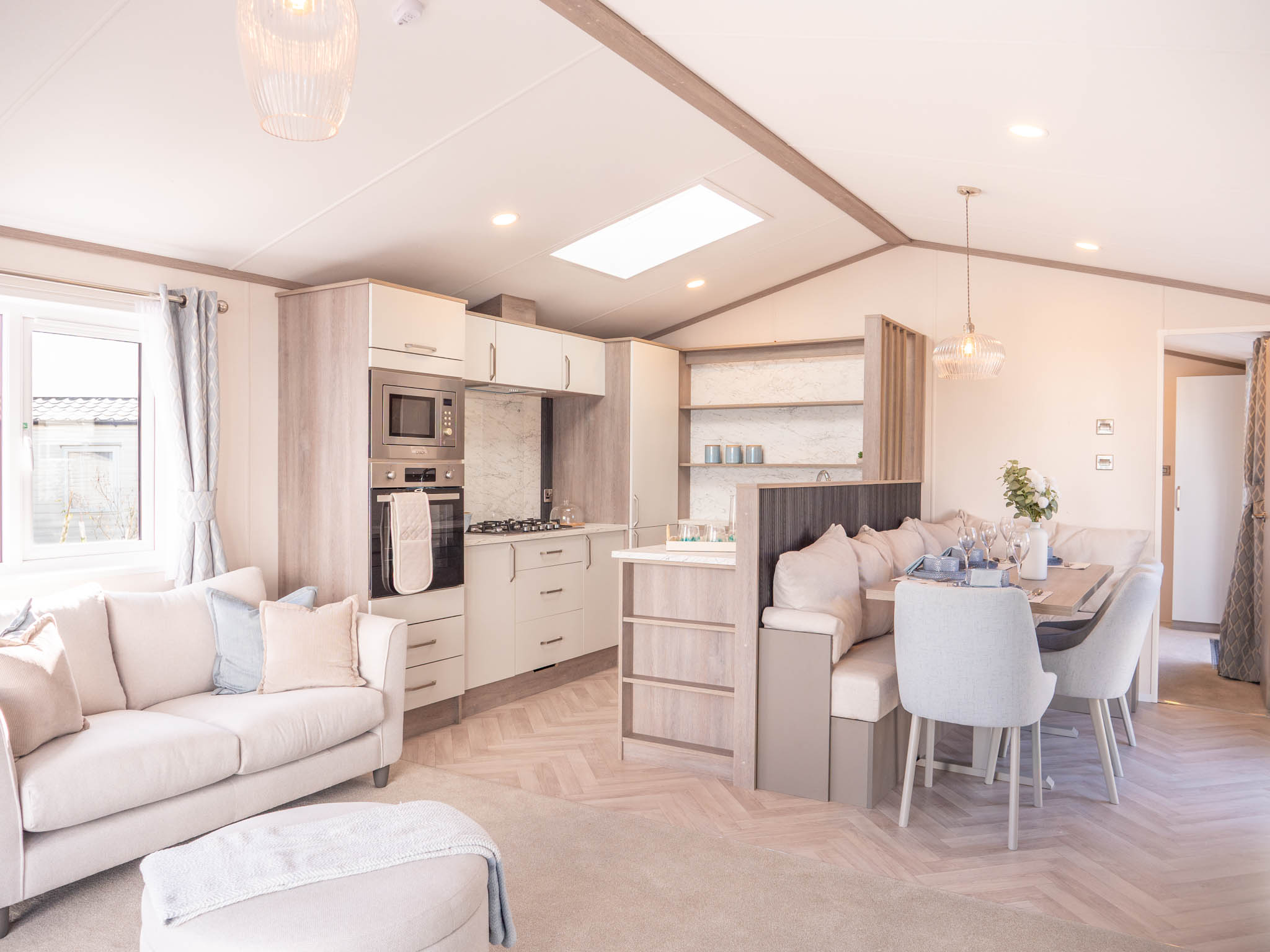The kitchen is beautifully designed, with a skylight above and everything you need to make mealtimes easy. Integrated appliances include a fridge freezer, dishwasher, washing machine, oven, grill and five-burner hob. A stylish half-wall leads through to a dining table that seats six in comfort – perfect for family meals or entertaining.
