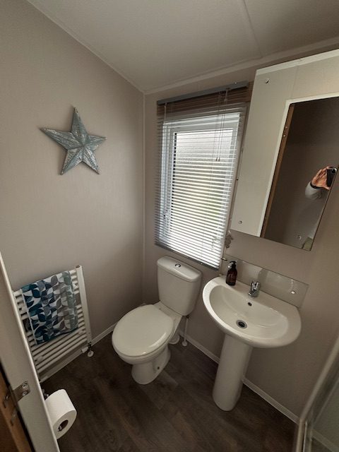 - Main bathroom with shower, WC, sink, storage cupboard, and heated towel rail