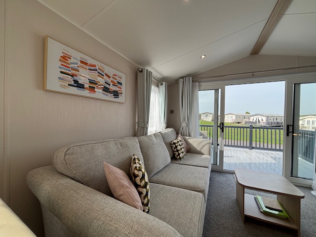 The lounge offers plenty of seating with a large 3-seater sofa bed and an additional 2-seater sofa. There is a TV stand, footstool, and useful storage, with sliding patio doors leading directly onto the decking, where a rattan outdoor sofa set (included in the sale) creates a great indoor-outdoor living space.