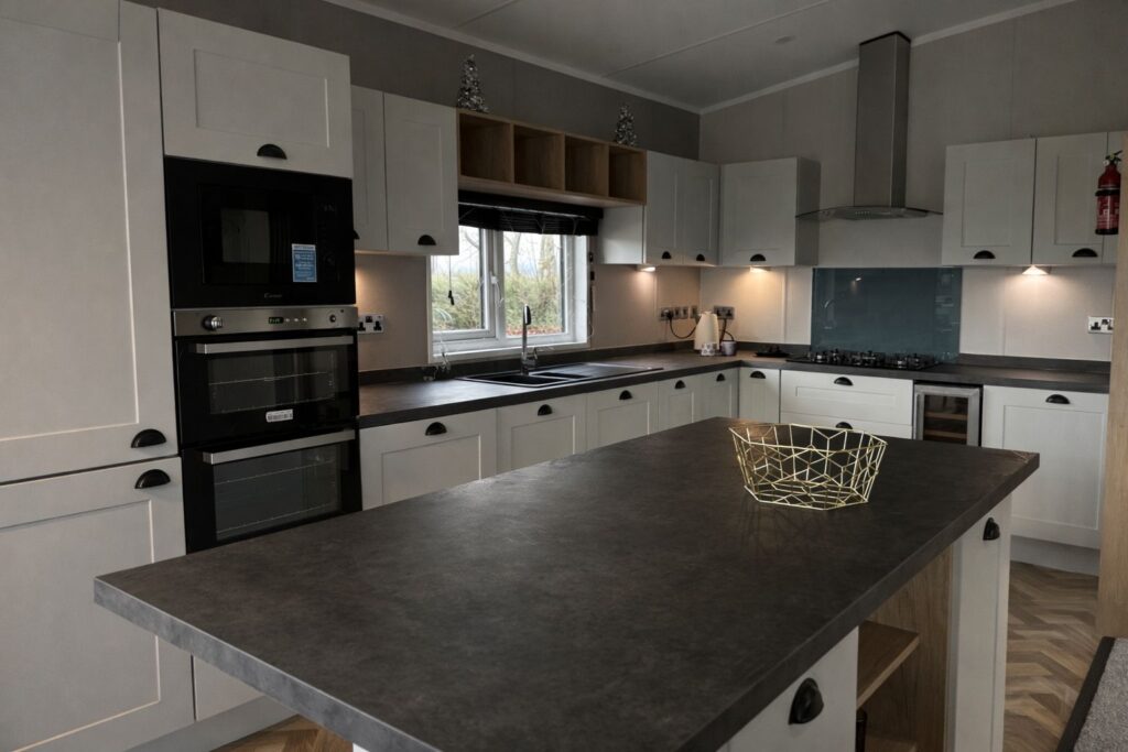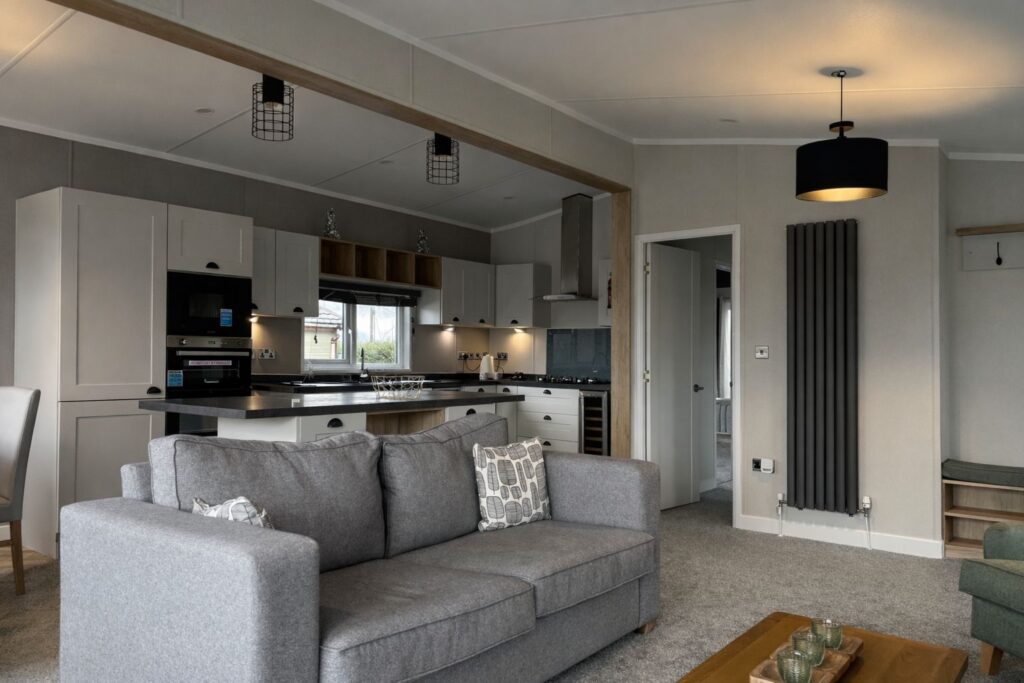 The expansive open-plan lounge, kitchen, and dining area forms the heart of the lodge. The lounge is bright and welcoming, with large windows that allow natural light to flood the space and frame the surrounding landscape. The kitchen is finished to a high standard with ample storage, quality work surfaces, and integrated appliances, flowing seamlessly into the dining area for relaxed, sociable living.