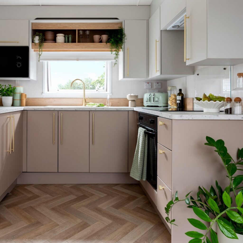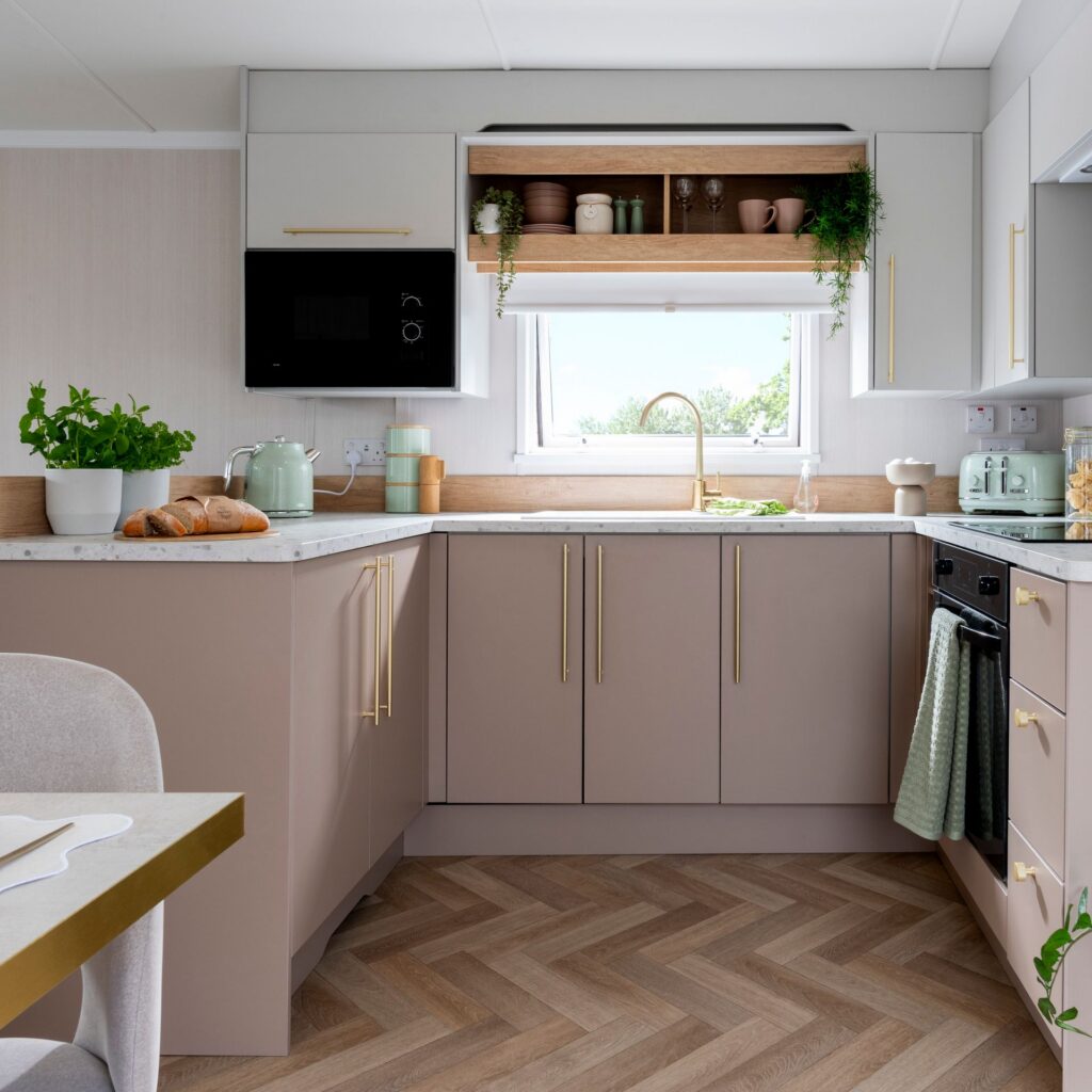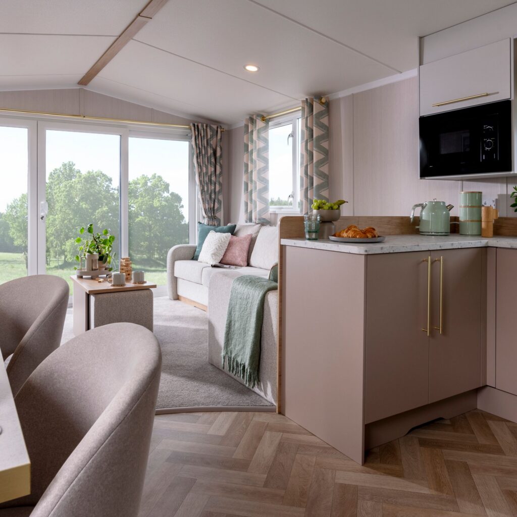 Inside, the smart layout makes the most of every inch. The spacious lounge features a fixed sofa with a round coffee table and a TV unit with generous storage and shelving — everything you need, nothing you don't. The modern U-shaped kitchen is fully fitted with a built-in oven and hob, integrated fridge freezer and microwave, all finished with those signature gold T-bar handles. Pull up a chair at the freestanding dining table and you've got the perfect setting for every meal of the day.