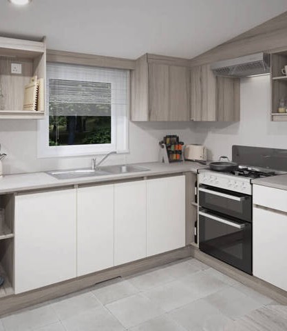 The Swift Royan at Sunbeach Holiday Park offers stylish, modern living with a bright lounge featuring a spacious L-shaped sofa and panoramic window. The contemporary kitchen boasts handle-less units, laminate worktops, and space for freestanding appliances, while the dining area includes a freestanding table with bench seating.