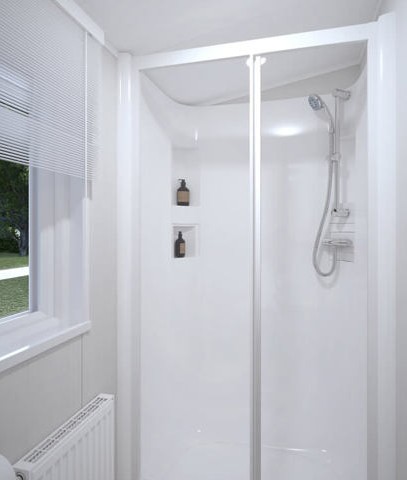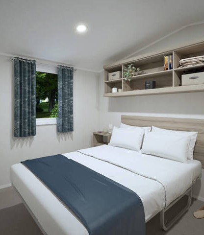 Both bedrooms feature comfortable Cignus Duvalay™ mattresses, with the main bedroom offering lift-up storage and ample wardrobes. The bathroom includes a thermostatic shower, dual flush WC, and vanity mirror with shelf.