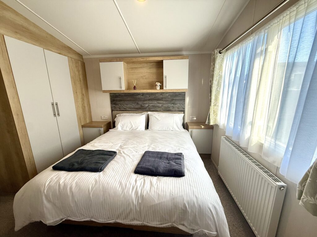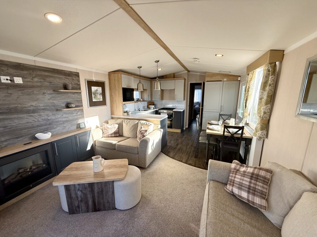 The bright, open-plan lounge offers freestanding sofas, a modern electric fire and French patio doors, filling the space with natural light. The fully fitted kitchen includes an integrated fridge-freezer, microwave and dishwasher, keeping mealtimes simple. The master bedroom features a private en-suite shower and generous fitted wardrobes, while the twin room provides cosy, flexible space for guests or grandchildren.