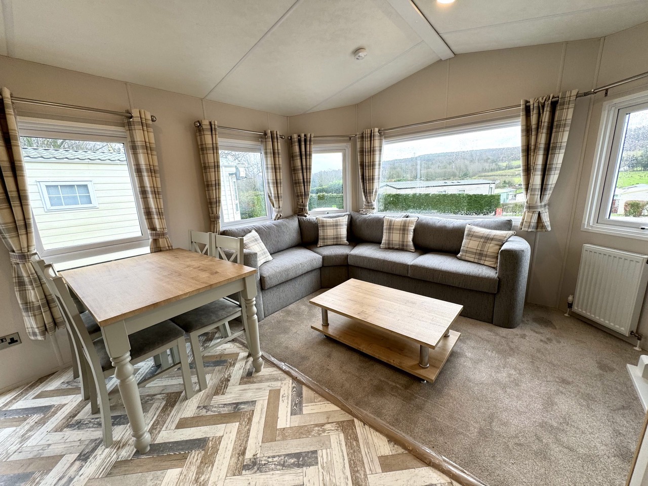 The bright, open-plan lounge offers freestanding sofas, a modern electric fire and French patio doors, filling the space with natural light. The fully fitted kitchen includes an integrated fridge-freezer, microwave and dishwasher, keeping mealtimes simple. The master bedroom features a private en-suite shower and generous fitted wardrobes, while the twin room provides cosy, flexible space for guests or grandchildren.