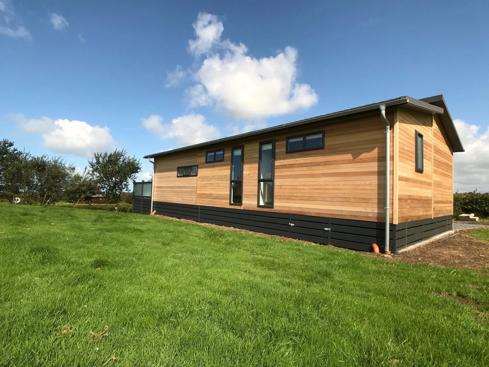 The living and dining area is welcoming and cozy, boasting a mix of soft grey furniture with natural wood accents that create a contemporary yet homey atmosphere. The leather chair with a wicker back stands out as a stylish decor piece. The room features a modern fireplace with a hidden space for media components, set against a distinctive board and batten wall, a design element echoed in the entryway, dining area, and master bedroom. The kitchen is the home’s focal point, cleverly designed with modern integrated appliances such as a dishwasher, washing machine, hob with a curved extractor, built-in oven, microwave, and a resin sink. It showcases shaker-style cabinets with wooden details above a unique letterbox window. The main bedroom promises restful nights with its high-quality pocket sprung and memory foam mattress, complemented by a timber bed frame, coordinated headboard, dressing area, and spacious wardrobe. Copper-trimmed hanging lights and wooden bedside tables add a touch of elegance. The bathroom and en-suite areas are equally stylish, featuring painted vanity units and mirrored cabinets. Available in various sizes starting from 40ft x 20ft, these homes offer 2 or 3 bedroom options and a choice between front facing or central living room layouts.