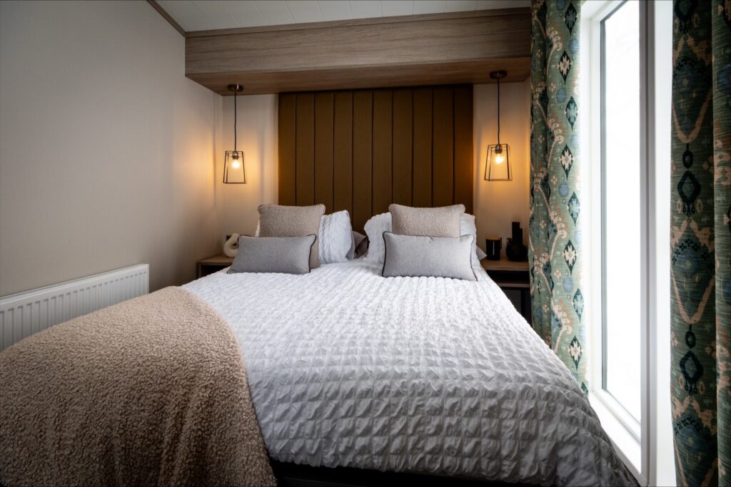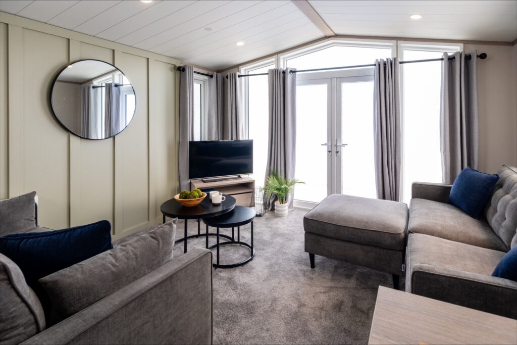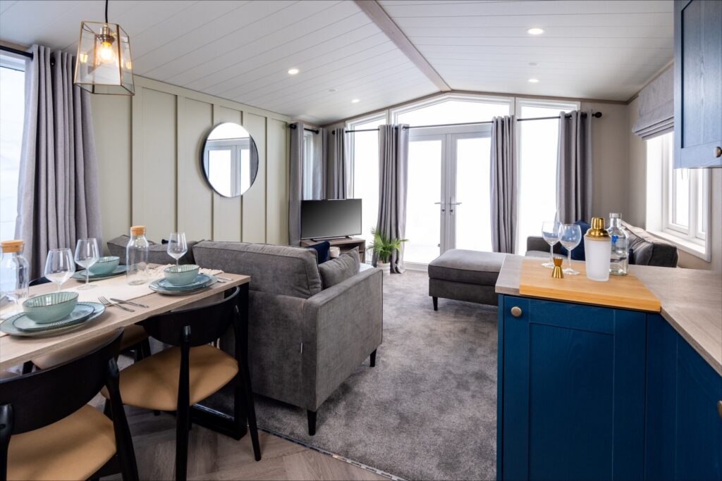 A boutique lodge fit for royalty. The Riverwood showcases a striking blue colour palette, balanced harmoniously with soft grey ascents. This luxury lodge boasts state of the art design features with its panelled walls, herringbone flooring and french opening front doors. Designed flawlessly with an open plan kitchen- living room, practicality really does meet unparalleled style with the Riverwood.