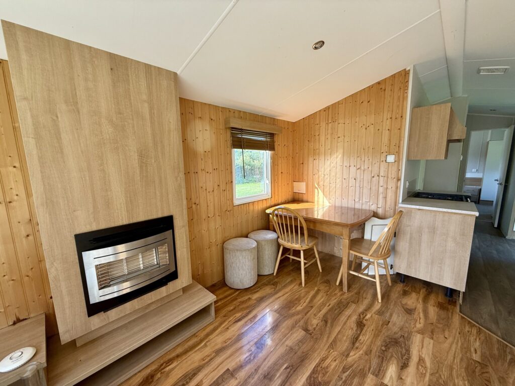 A charming two-bedroom mini lodge offering warmth, style, and peaceful escape. Inspired by Scandinavian wooden interiors, the open-plan lounge and diner feel bright, inviting and made for unwinding — complete with a cosy fireplace feature for snug evenings in.