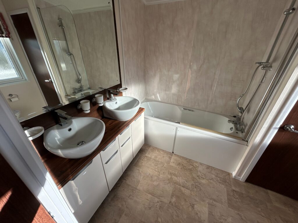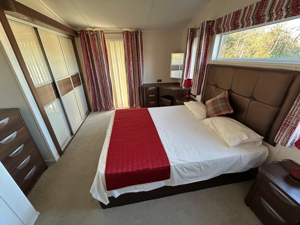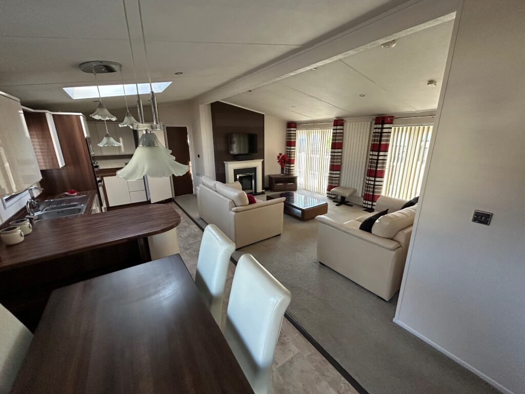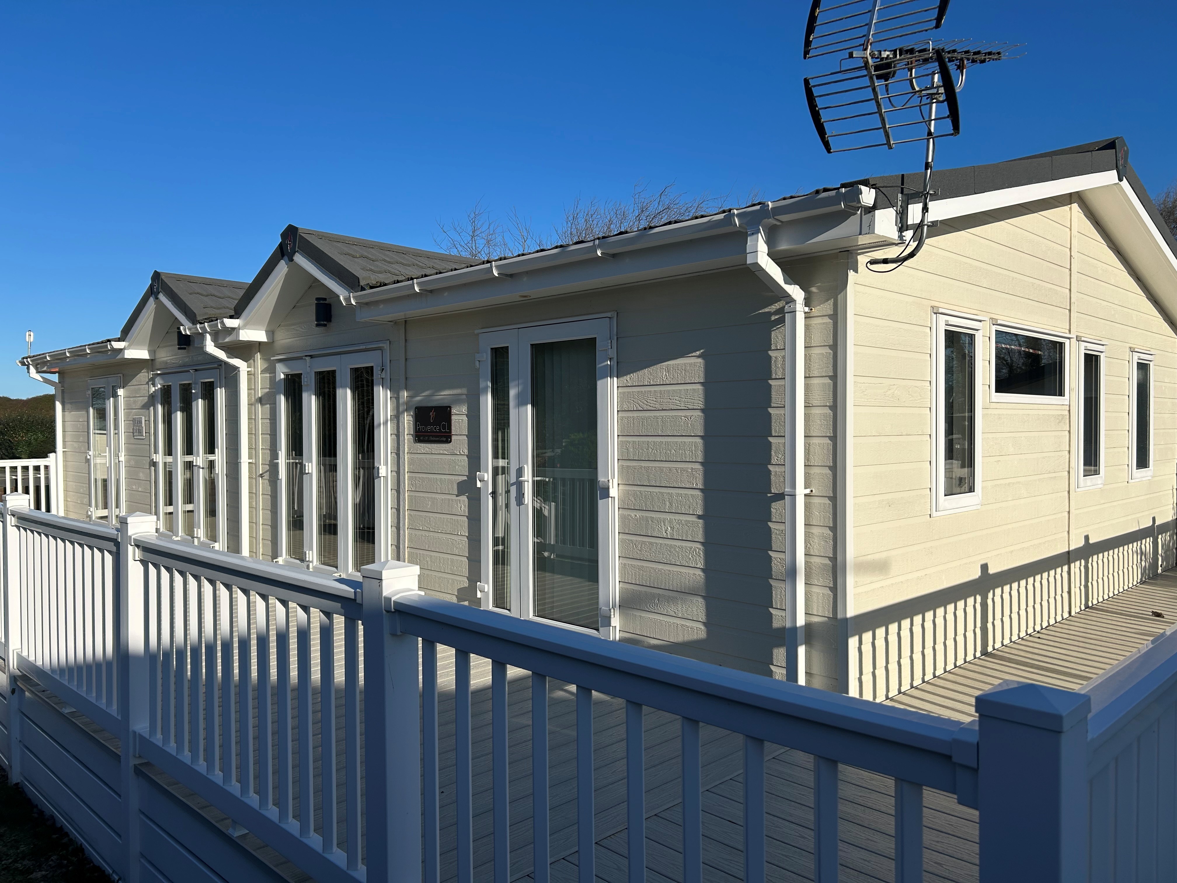 The Victory Provence greets you with large bi-fold doors, the lodge immediately feels luxurious, styled in cream, dark wood and touches of red. To the left is the lounge and to the right the modern kitchen, divided by an angled breakfast bar and opening onto a compact dining area for four.