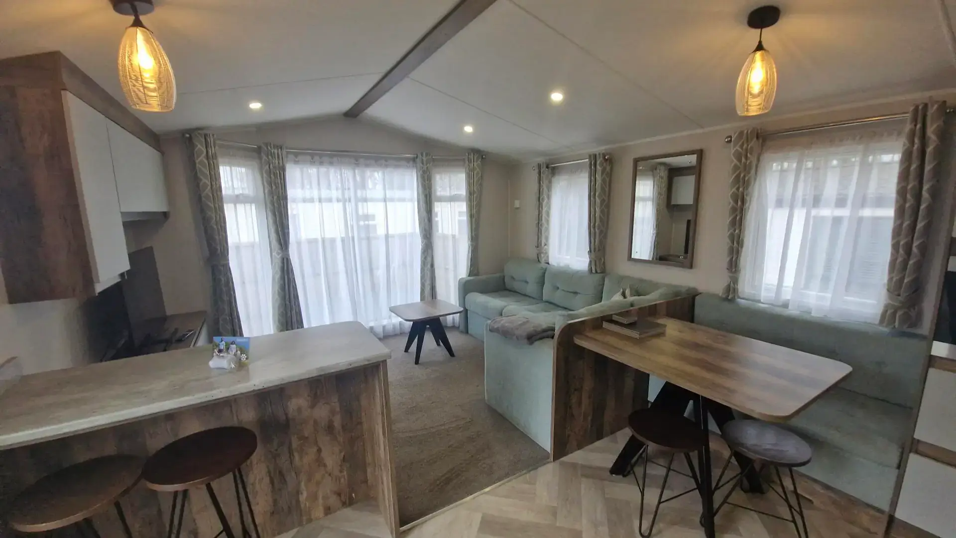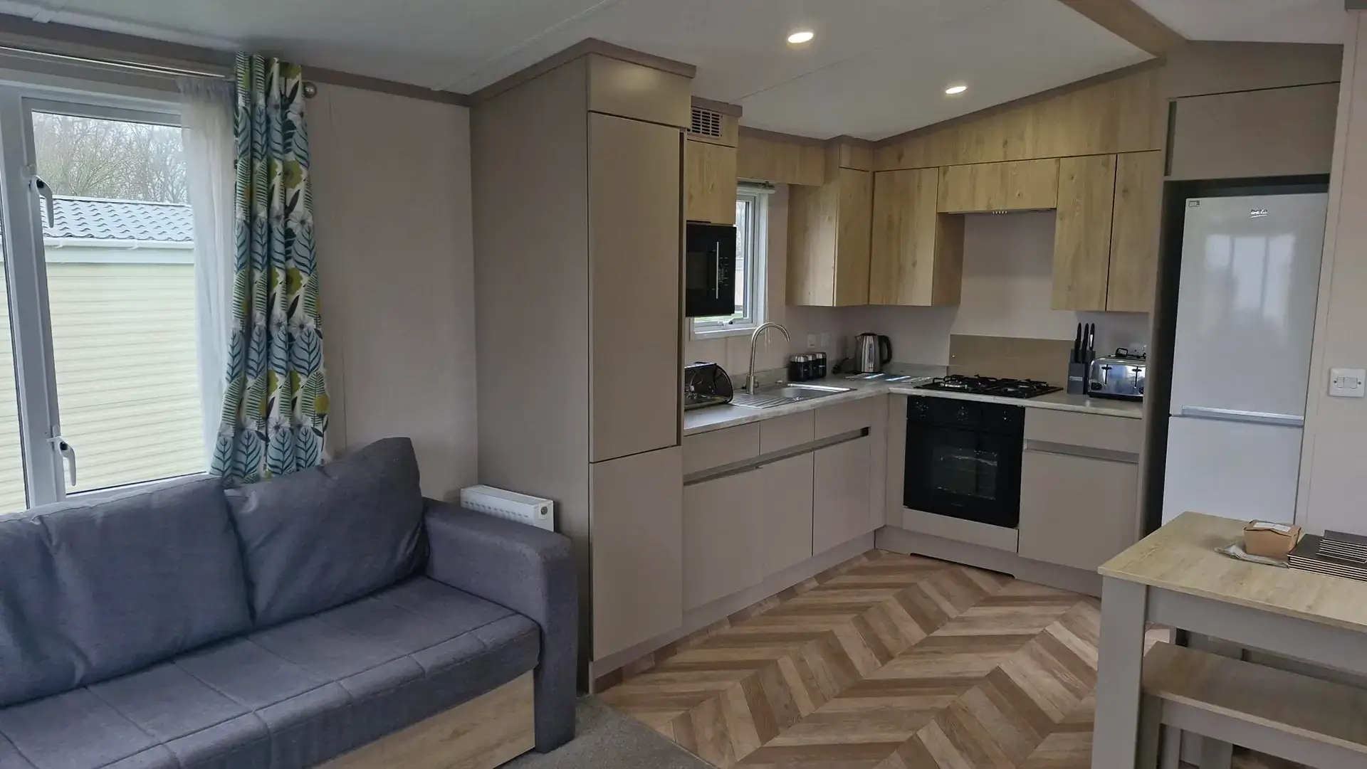 Inside, you'll find a light and inviting living space with comfortable seating, an open-plan design, and a modern, fully equipped kitchen.