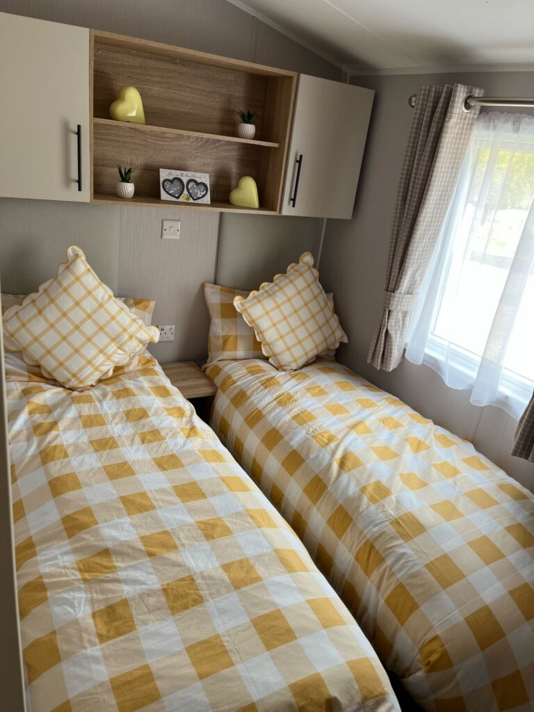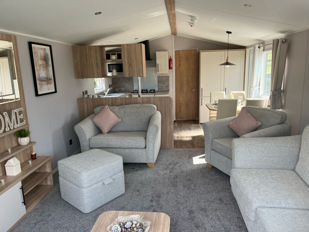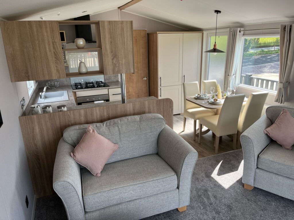 The caravan is double glazed and fitted with central heating for use throughout the seasons. It also includes a dishwasher, TV aerial, two gas bottles, skirting, and an access step already installed. A 15-year licence is in place, offering longer-term security on park.