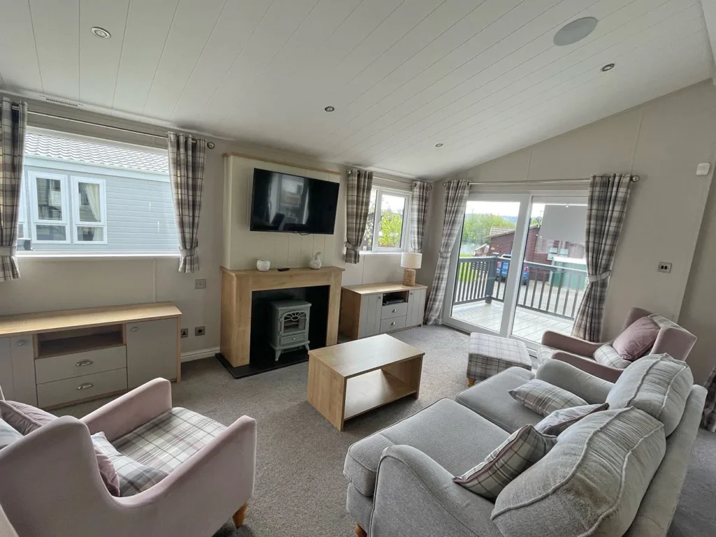 The Willerby Portland is a luxury lodge with a classic country feel, featuring blush pink and oak tones throughout. The open-plan kitchen and living area is spacious and welcoming, furnished with free-standing furniture for comfort and style. Patio doors open onto the decking, offering stunning views of the lake — the perfect spot to relax and enjoy the surroundings.