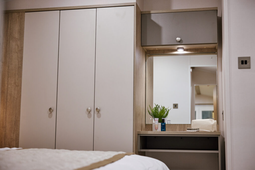 The main bedroom features a king-size bed with an upholstered headboard and lift-up storage, complemented by wardrobes, bedside cabinets, a mirrored dressing area with a cube stool, a TV point, and a convenient en-suite WC.