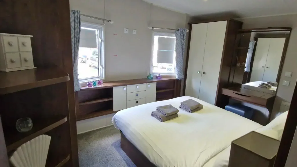 The master bedroom includes a king-size bed and en-suite facilities, while the second bedroom provides comfortable guest accommodation. The caravan benefits from large decking, partial sea views, integrated appliances, and practical storage throughout. 2026 site fees are included, and owners benefit from access to facilities at Lady’s Mile Holiday Park.