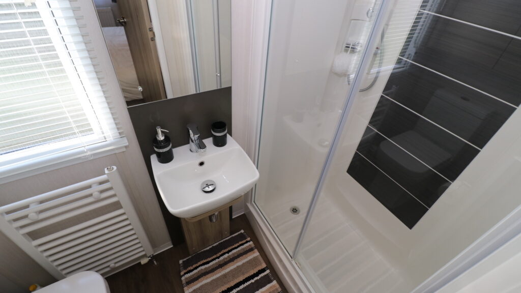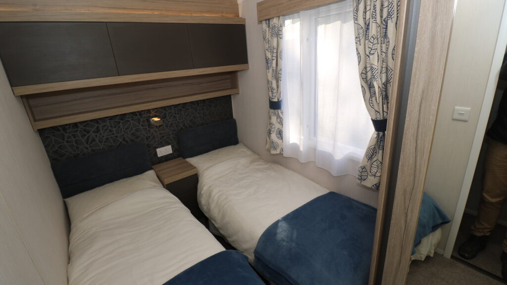 Both bedrooms are designed with comfort in mind. The master bedroom offers a soft, soothing colour palette, a comfortable bed, and excellent built-in storage, making it a restful space to retreat to, and the bonus of an en-suite bathroom. The second bedroom features twin beds and thoughtful storage solutions, making it perfect for guests or family visits. The main bathroom is modern and functional, with a spacious shower and contemporary fittings that add to the overall polished feel of the holiday home.